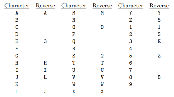 例如,"3AIAE"是鏡像字符串,因為"A"的鏡像和"I"的鏡像是他們自己,而"3"和"E"為彼此的鏡像。