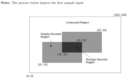 他用四個整數x1,y1,x2,y2定義了守衛需要守護的區域。(x1, y1)是該區域的左下角座標,(x2, y2)是該區域的右上角座標。