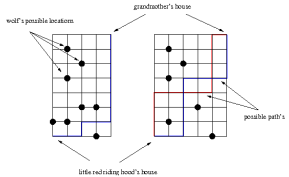 There are 2 paths from Little Red Riding Hood's house to her grandmother's house. There is no path. There are 7 paths from Little Red Riding Hood's house to her grandmother's house. There are 184756 paths from Little Red Riding Hood's house to her grandmother's house. There is no path. There is one path from Little Red Riding Hood's house to her grandmother's house.