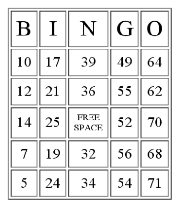 這些格子從左到右分別用字母標記:"B","I","N","G","O"。除了中心標記"free space",卡片中其餘數字分配有如下: