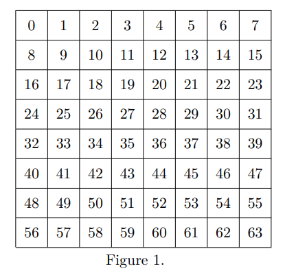 我們有一個8x8的西洋棋棋盤,從左上角到右下角編號0到63(從左到右編號)。