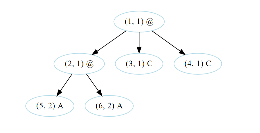 接下來 $n$ 行,每行表示一種病毒,包含兩個整數 $i, j$ 與一個字串 $s$,表示編號 $i$ 的病毒是從編號 $j$ 的病毒演化而來的,且編號 $i$ 的病毒的 RNA 序列為 $s$。若編號 $i$ 的病毒是最原始的病毒,則 $j=i$,保證這樣的病毒只會有一個。