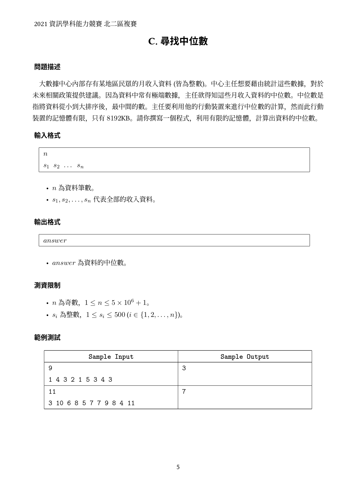 備註:依照題目設定,本題額外記憶體使用上限為 8192 KB = 8 MB