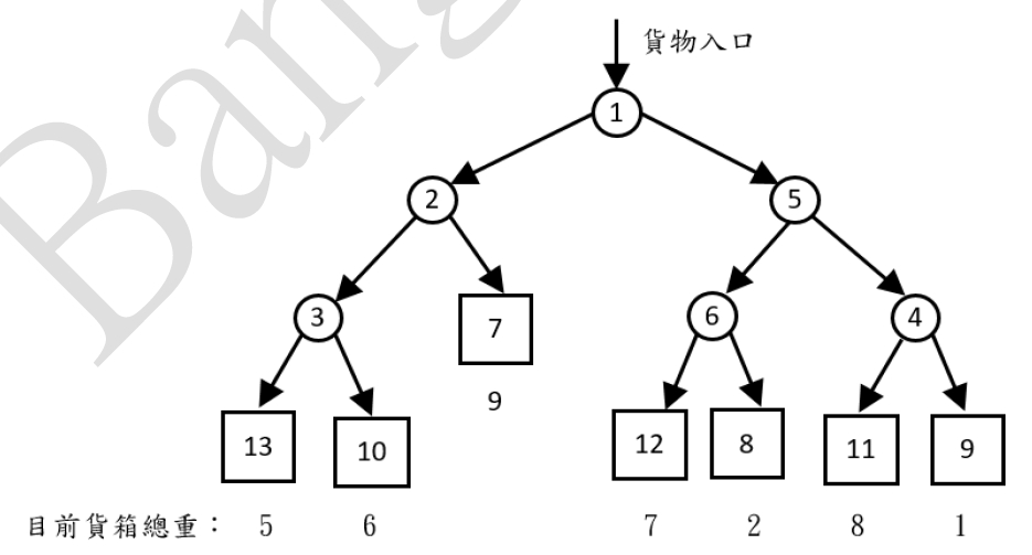 輸入此系統的連接架構與貨箱目前的重量,以及接下來依序進入的 $m$ 個貨物的重量,請計算這 $m$ 個貨物分別會被送到哪一個貨箱。