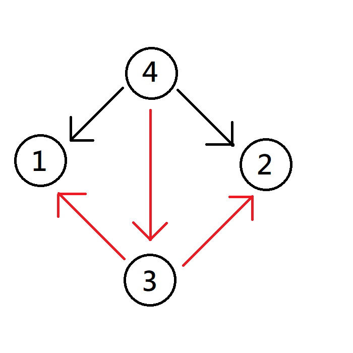 在範例輸入#2中,我們可以以這張圖為示意圖,其中$i$指向$j$代表$i$抄了$j$的作業,並且以顏色來表示小抄(黑色+紅色)及大抄(紅色)。