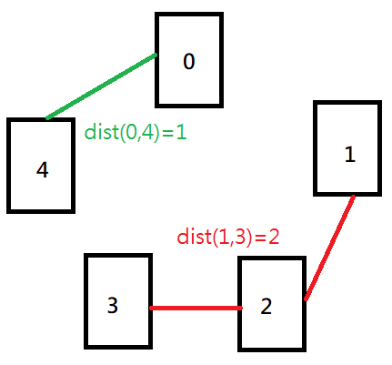 首先定義任兩張牌$\color{black}{a}$、$\color{black}{b}$的距離$\color{black}{dist(a,b)}$代表$\color{black}{a}$從順時針或逆時針方向兩邊沿著圓到達$\color{black}{b}$,中間經過的距離的最小值,這裡定義兩個相鄰的紙牌之間距離$\color{black}{1}$,因此在$\color{black}{N=5}$時,也就是有五張紙牌時可以畫出上面那張圖,其中$\color{black}{dist(1,3)=min(2,3)=2}$、$\color{black}{dist(0,4)=min(1,4)=1}$,另外定義如果$\color{black}{a=b}$時,則$\color{black}{dist(a,b)=0}$,簡單來說距離的定義就是如果$\color{black}{a≥b}$,則$\color{black}{dist(a,b)=min(a-b,N-a+b)}$。