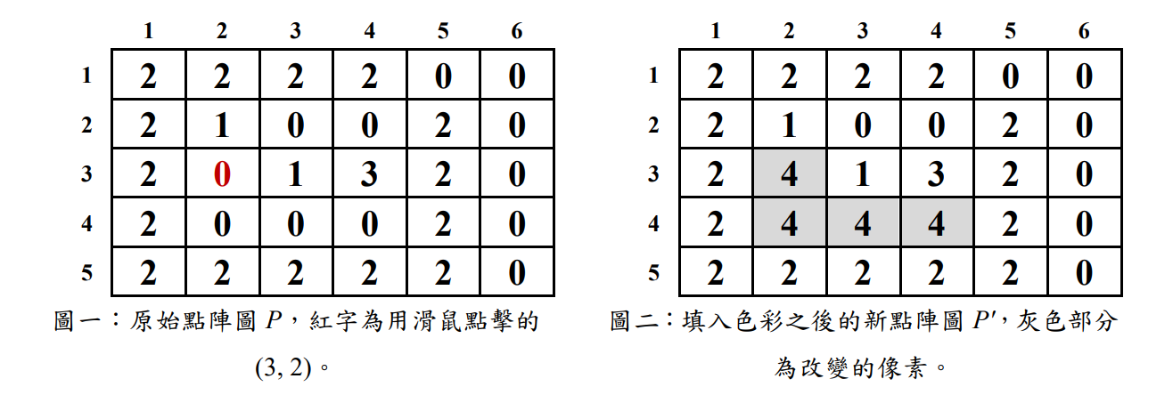 請寫一個程式在給定原始點陣圖 $\color{black}{P}$ 的資訊的情形下,模擬「填入色彩」$\color{black}{Z}$ 之後的新點陣圖 $\color{black}{P'}$。