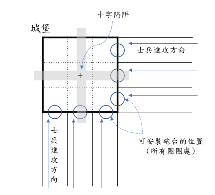 小東最近迷上一款戰略遊戲,在這個遊戲中你可以建造屬於自己的莊園,進攻並佔領他人的城堡掠奪資源;也可以設下守備避免他人攻擊自己的城堡。由於系統告訴小東有人要進攻他的城堡了,他開始部屬防禦。這個遊戲中的城堡可以被視為大小為 $\color{black}{M\ \times\ N}$ 的矩形,敵人的士兵會從城堡某一直行的下方往上朝向城堡進攻,或者從某一橫列的右方往左朝向城堡進攻;而玩家可以在城堡每一直行的最下方,以及每一橫列的最右方城牆上設置一座防禦砲台,或者是在城內設置十字陷阱以抵禦攻擊(如下圖)。雖然小東的城堡已經安裝了一些十字陷阱,但在上次整修之後還沒有安裝任何一座砲台,因此小東想把所有的預算花在安裝砲台上。