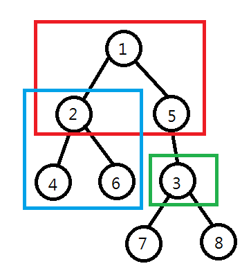 綠色的則是第三個查詢,$S_3 = ( 3 )$,也就是點$3$的自己與$0$代以內子孫,所以答案為$3$,注意這個$case$的$K_i = 0$,所以$S_3$裡只有它自己。