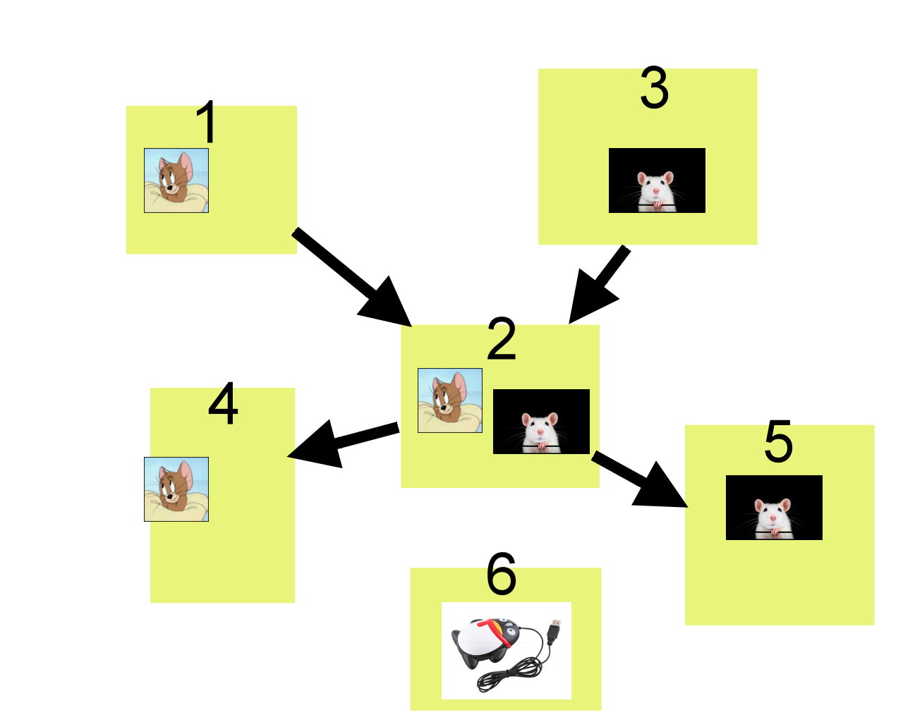 以下為範例一的迷宫,第一張圖為原本隔間與通道的樣子,第二張圖為每個隔間分別被哪些小老鼠走過,最少需要 $3$ 隻小老鼠才可以讓所有隔間被走到。