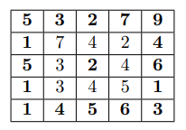 假設你有一個大小為 5 × 5 的整數正方形,如下圖: