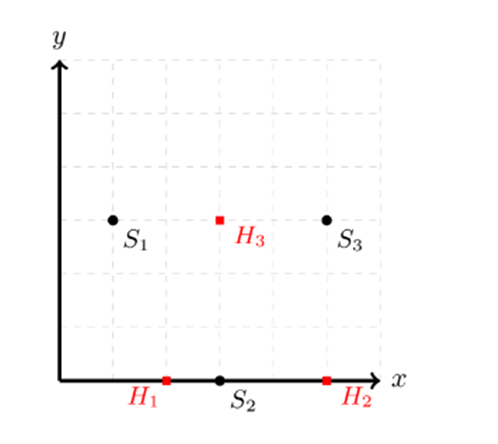 如下圖為一 $n = 3$ 且 $m = 3$ 的例子,其中正方形的點 $H_1, H_2, H_3$ 分別代表房屋 $1, 2, 3$,圓點 $S_1, S_2, S_3$ 則分別代表捷運站 $1, 2, 3$ 的位置。並且:
