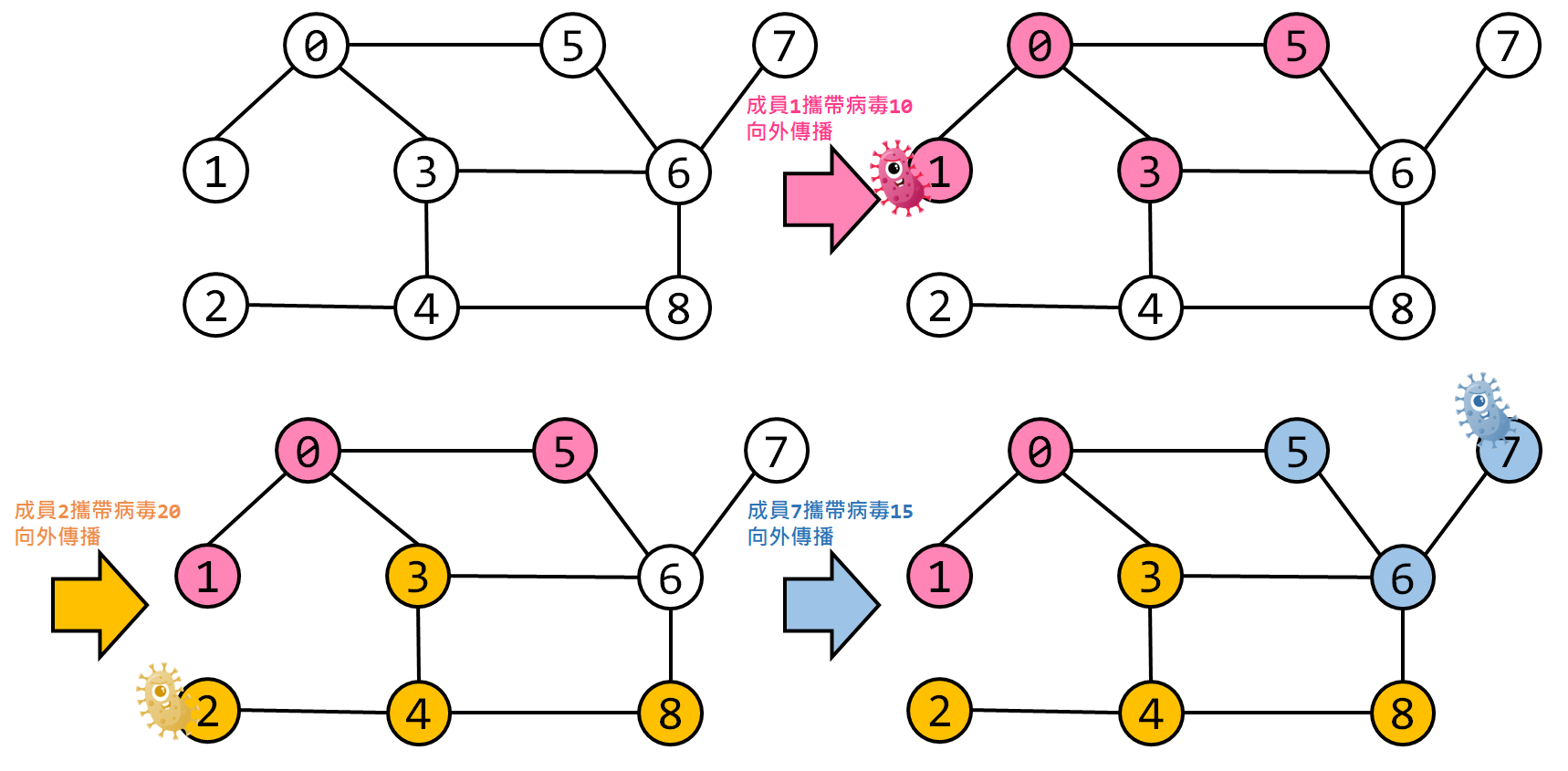 首先(成員1)為(病毒10)的帶原者,並將(病毒10)往外傳播,即往外傳播給(成員0、3、5)