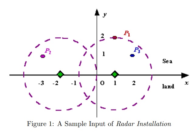 我們使用笛卡爾坐標系統,將海岸定義為x軸。海洋一側在x軸上方,陸地一側在下方。給定每個島在海中的位置,並給定雷達裝置的覆蓋距離,您的任務是編寫一個程式,找到覆蓋所有島嶼所需的最小雷達裝置數量。請注意,島嶼的位置由其x-y坐標表示。