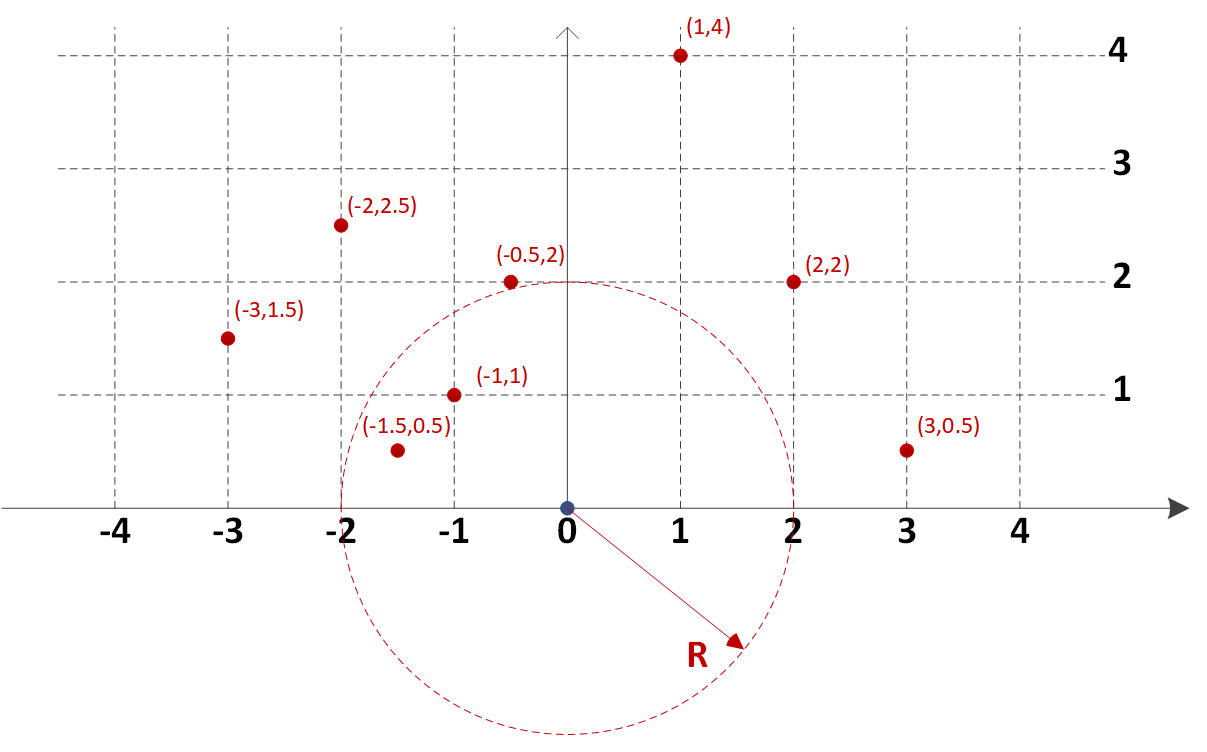 天龍國有 N 個離岸島嶼,今欲架設沿岸的無線基地台覆蓋這些島嶼,基地台型號為WP1450A,覆蓋範圍為半徑 R 的圓(包含圓周);若海岸線為一水平線(可視為水平 x 坐標軸),每個離岸島嶼 i 有座標 xi、yi ,為了節省經費,國王希望以最少的基地台數,覆蓋所有可以覆蓋的島嶼,作為總工程師的你,請設法解決此一難題。