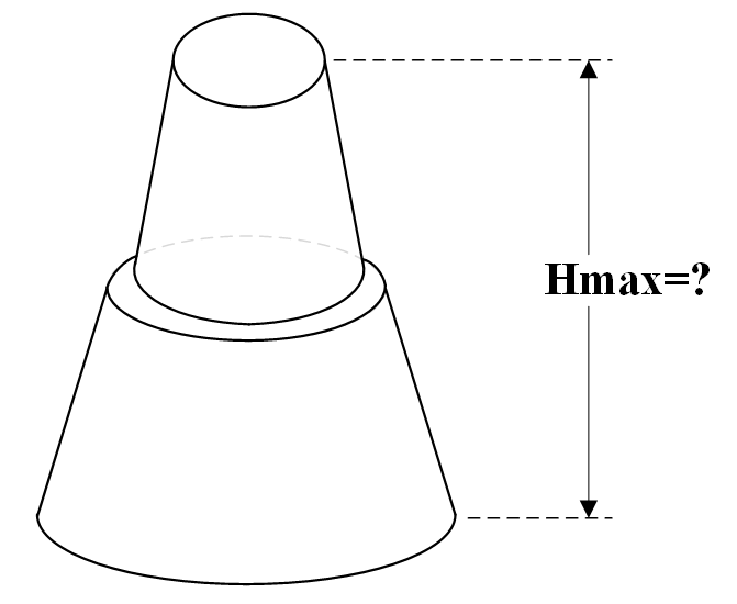 給定 N 個多種尺寸的圓錐台(如下左圖),底部圓半徑為 R,頂部圓半徑為 r (r<R),高度為 h,將這些圓錐台向上堆疊,接合面必須上面的圓小於下面的圓(如下右圖),試問可以堆疊的最大高度 Hmax 為何?