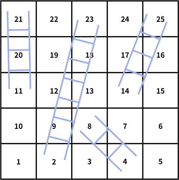 遊戲一開始,玩家會在棋盤中的第 $1$ 格,玩家以每次擲骰子的點數 $x$($1\le x\le 6$)為前進步數,從 $i$ 移動到 $\text{min}(i+x, N)$,若 $i+x$ 包含了某個梯子的起點,就必須直接前往梯子的終點。注意,每次移動只會爬一次梯子,即便到達梯子的終點後該位置仍然有其它梯子的起點。遊戲將持續直到玩家到達最後一格 $N$ 就視為遊戲結束。
