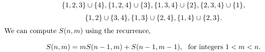 第二種 Stirling 數 S(n, m) 代表將一組 n 個物品分成 m 個非空子集的方式數量。例如,將一個有四個元素的集合分成兩部分有七種方式: