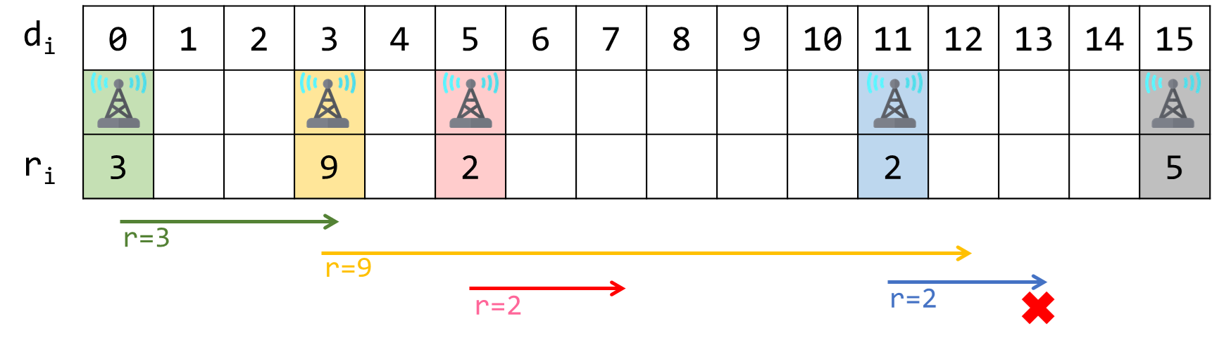 對於每個基地台,已知其 (擺放位置 d) 和 (訊號可向右傳送範圍 r),