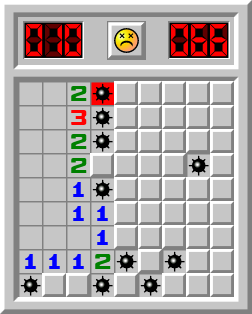 當你點開的方塊下面是地雷時,遊戲就結束了,它會顯示所有的地雷,並給你一個哭臉。例如在下圖點開 (1, 4) 的位置 (該位置顯示紙底。