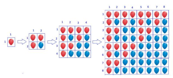 正如你所看到的,位於單元格 (i, j)(即第 i 行和第 j 列)的紅色氣球將增殖為 3 個紅色氣球,分別位於單元格 (i ∗ 2 − 1, j ∗ 2 − 1)、(i ∗ 2 − 1, j ∗ 2)、(i ∗ 2, j ∗ 2 − 1),以及一個藍色氣球位於單元格 (i ∗ 2, j ∗ 2)。而位於單元格 (i, j) 的藍色氣球將增殖為 4 個藍色氣球,分別位於單元格 (i ∗ 2 − 1, j ∗ 2 − 1)、(i ∗ 2 − 1, j ∗ 2)、(i ∗ 2, j ∗ 2 − 1),以及 (i ∗ 2, j ∗ 2)。為了容納額外的氣球,每小時網格的大小都會加倍(在兩個方向上)。