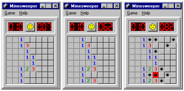 這裡,n 是 8,m 是 10,空白方格代表整數 0,凸起的方格代表未被觸摸的位置,類似星號的符號代表地雷。最左邊的圖片代表部分遊戲過程。從第一張圖片到第二張圖片,玩家進行了兩次移動,每次都選擇了一個安全的網格位置。從第二張圖片到第三張圖片,玩家沒有那麼幸運;他選擇了一個有地雷的位置,因此輸了。如果玩家持續選擇安全的移動直到只剩下 m 個未觸摸的位置,他就會獲勝;這些位置必然包含地雷。