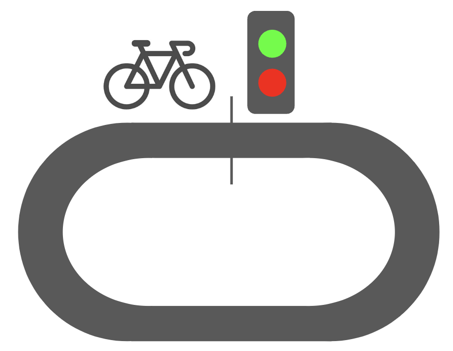 綠燈 $10$ 秒,紅燈 $10$ 秒,繞一圈需要 $14$ 秒,當回到起點線時還需要等待 $6$ 秒的紅燈。