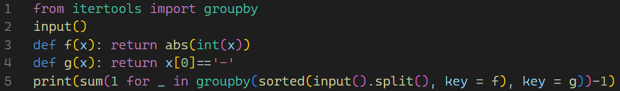 1. sorted有key參數,可以幫忙依照絕對值排序而不動到原始正負號資訊(甚至不須將input()字串轉型成int!)