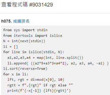 每個人的tuple = (加權, 資訊, 數學,英文, 座號小的在前面也就是加負號會反轉座號順序,因為還要考慮reverse)
