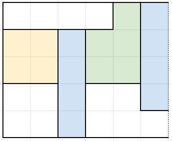 以範例輸入二為例,貨物推完的結國如下圖:(白色為倉庫剩餘的空格數量,一個E,一個B 被丟掉了)