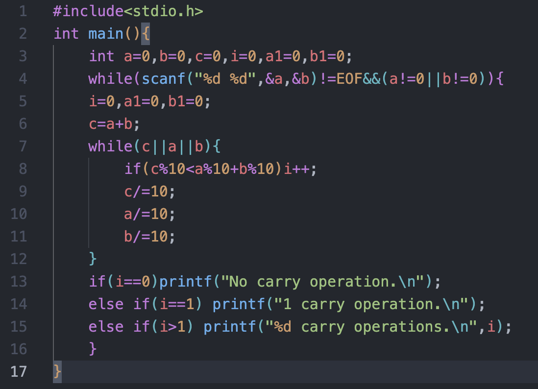 取c,a,b的每位數,c的其中一位數小於a+b的那一位數,代表進位