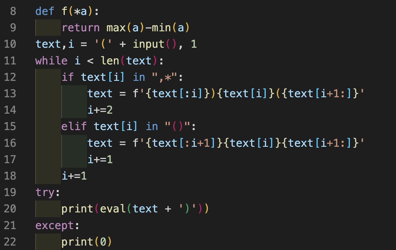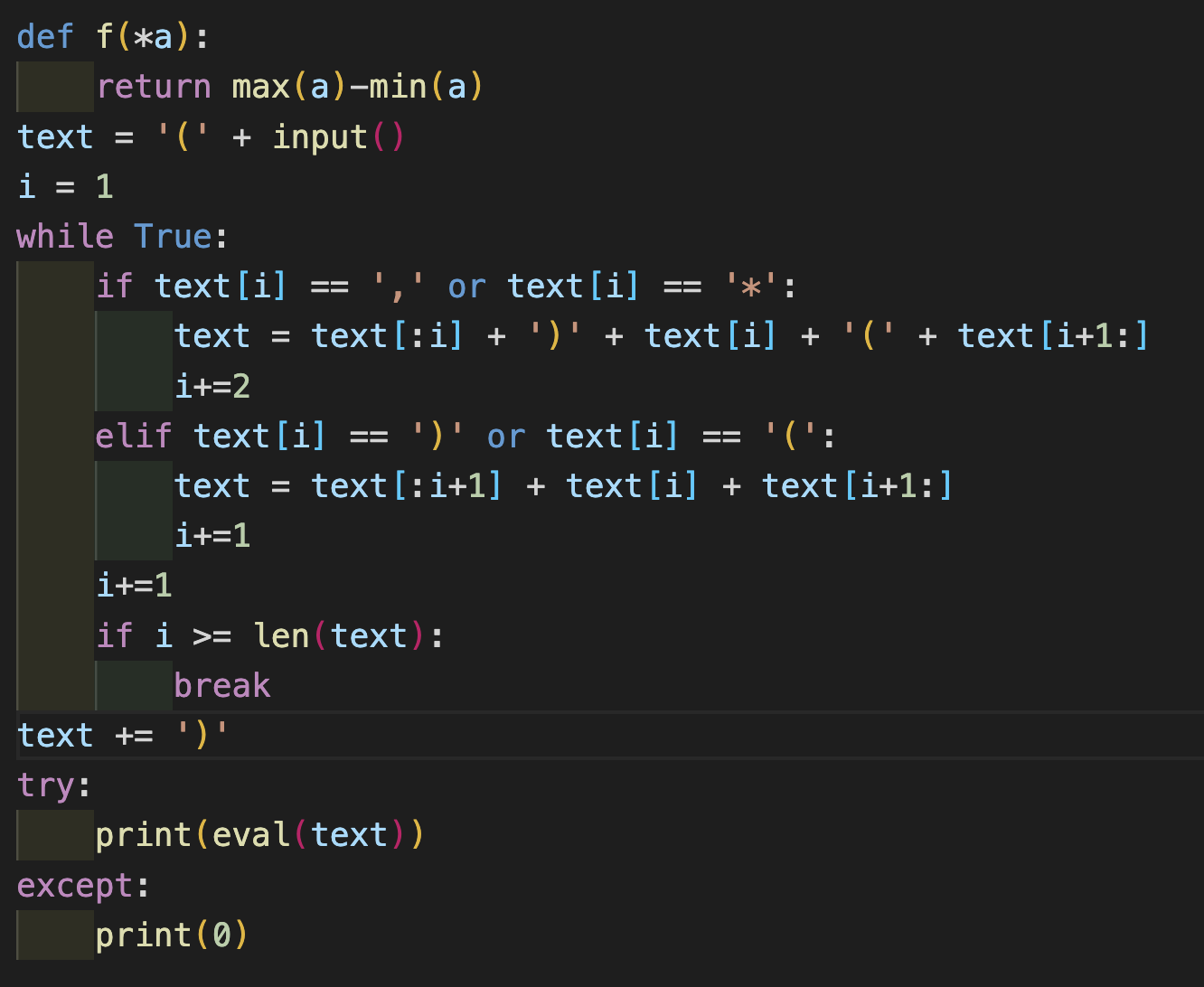 print(eval("(" + input().replace("(", "([(").replace(")", ")])").replace(",", "),(").replace("*", ")*(") + ")", {"f": (lambda l : max(l)-min(l))}))