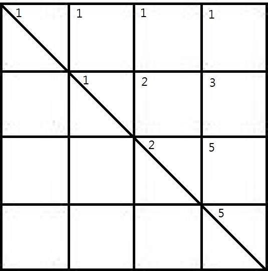 令山坡向上和向下方別為矩陣(一個點,而非一格是一個空間)裡的向右和向下。因為山坡不可低於地平線,所以向下的次數必小於等於向上,等同於把矩陣所有滿足r=c的[r][c]連成一條線,只有直線右上半部(r<=c)是可以走的。和最常見的走捷徑問題一樣,因為到達每一點的方法皆是從該點左邊或上面那點,所以每點的方法數等於上面那點的方法數和左邊那點的方法數相加,前幾點的方法數如圖中所示。因最後會回到地平線(r=c),所求方法數便是直線r=c上的點的方法數。
