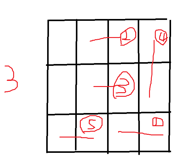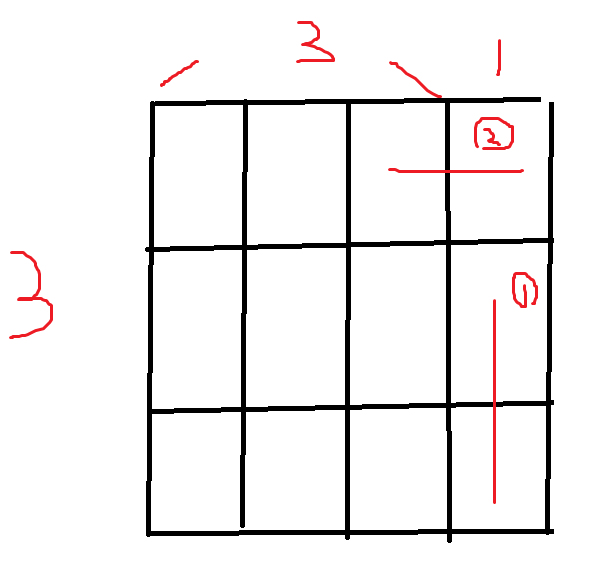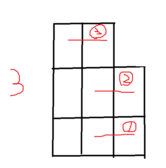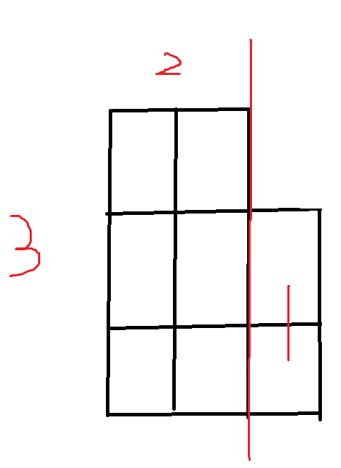 右下角放直的磁磚(1)處,再來可以發現右上角的空間(2)處僅能放橫的,那問題變成解3*3缺一角的圖形有幾種放法(dp[1][3])