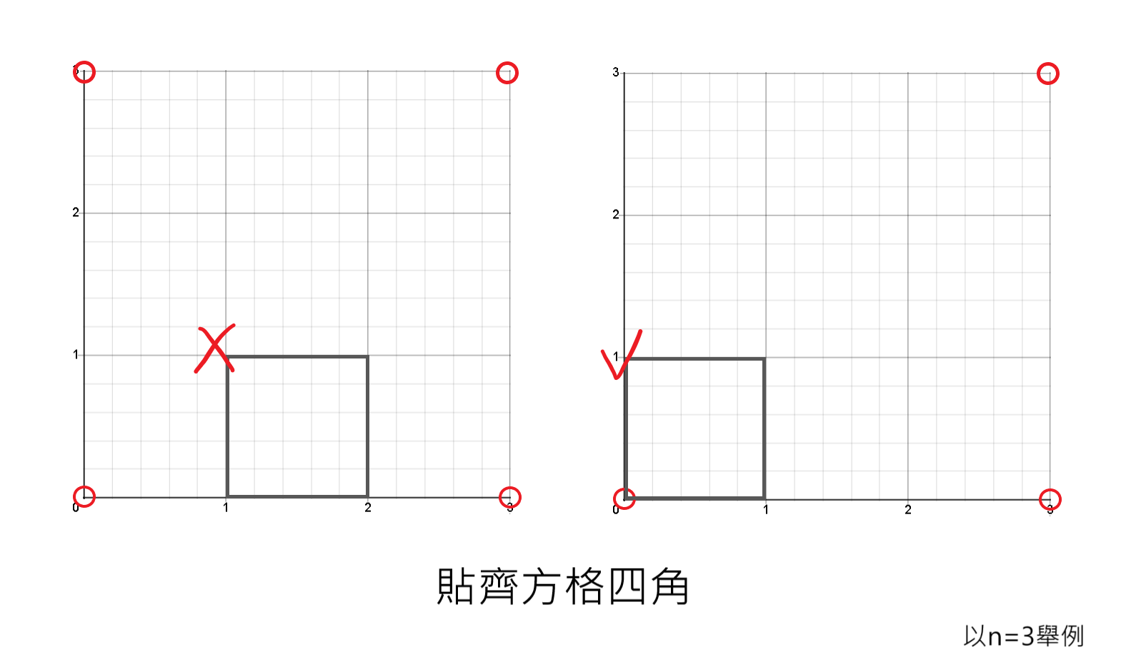 n>2 時,為了使用「最少的正方形」完成,畫的正方形必須貼在方格的四個角
